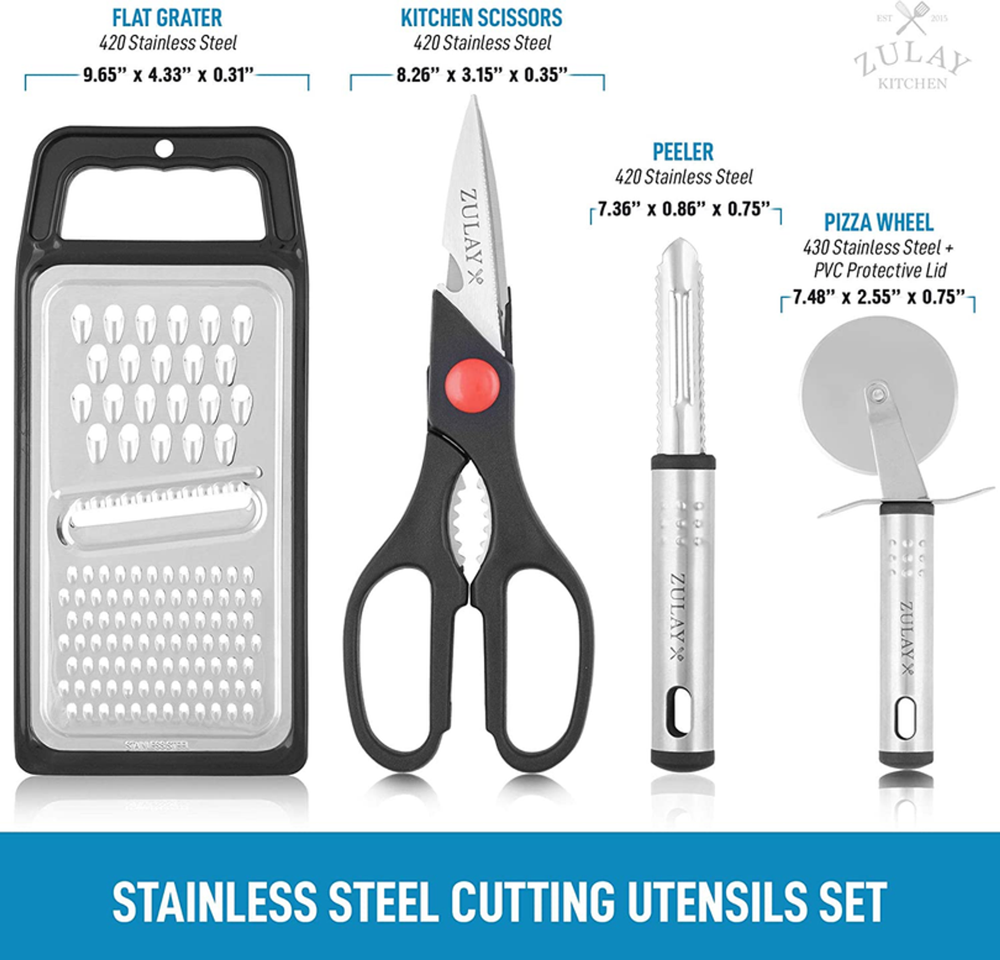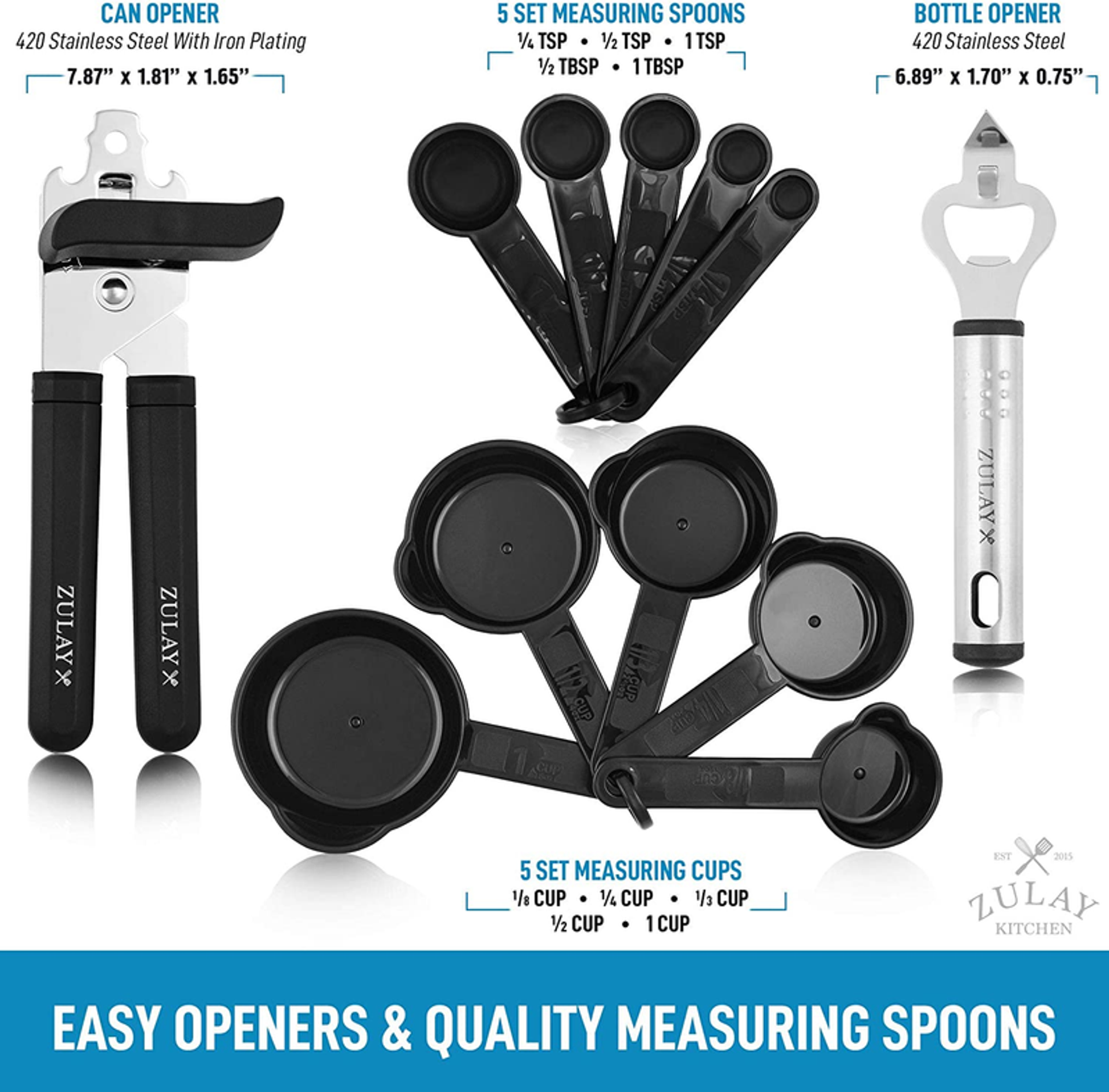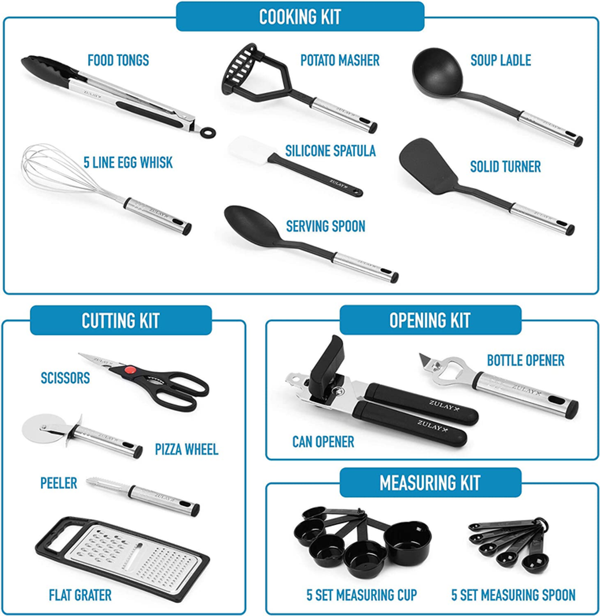 ALL-IN-ONE KITCHEN ESSENTIALS A wide selection of kitchen utensils made from stainless steel and heat-resistant nylon that are designed to be functional attractive and well-built. This 23 piece utensil set includes a spoon ladle turner masher egg whisk flat grater kitchen scissor silicone spatula pizza wheel peeler bottle opener can opener food tongs measuring cup set of 5 and measuring spoon set of 5. This product will definitely fill up your utensil drawers to the brim. BEST MATCH FOR NON-STICK POTS AND PANS Start using the right tools. The Zulay Kitchen Utensil Set - 23 Nylon Cooking Utensils are made of high-quality non-toxic nylon material that has a high heat tolerance to prevent the utensil from melting up to 392 when in use; its scratch-resistant soft edge feature ensures the protection of your precious pans and pots. Look no further this set has everything you could ever need for your kitchen! EASY TO USE & CLEAN Premium quality stainless steel handles ensure a durable and sturdy design that is built for long-lasting use. Its lightweight construction comes with a hanging loop on each end for easy carriage and storage. Easy to use and clean can be washed by hand or cleaned in the dishwasher. AFFORDABLE GIFT SET A perfect set for someone starting fresh on their own without having to spend a fortune on all the kitchen basics to get started. It comes with everything that you need with its great selection visual attractiveness and super affordable price point It would make an amazing house warming gift a gift to a friend that likes to cook or even for your own personal use. NO HASSLE KITCHEN HAPPINESS ZULAY GUARANTEE We love and take pride in our Kitchen Utensil Set - 23 Nylon Cooking Utensils and we back this up with a lifetime guarantee. Have the confidence that this product will last if there are ever any issues just contact us and we will make it right. Order now and be assured that this product will live up to your expectations guaranteed. If it does not we got you covered. Chances are you will never need to reach out! All-In-One Kitchen Essentials Made from stainless steel and heat-resistant nylon Functional attractive and well-built design Includes a spoon ladle turner masher egg whisk flat grater kitchen scissor silicone spatula pizza wheel peeler bottle opener can opener food tongs measuring cup set of 5 and measuring spoon set of 5 Best Match For Non-stick Pots And Pans Made of high-quality non-toxic nylon material Heat resistant up to 392Scratch-resistant ensures the protection of your precious pans and pots Easy To Use & Clean Durable and sturdy handle Designed to last for a very long time Lightweight and dishwasher-friendly Has a hanging loop on each end for easy carriage and storage Affordable Gift Set Perfect set for someone starting fresh on their own Comes with everything that you need with its great selection visual attractiveness and super affordable price point Awesome house warming gift a gift to a friend that likes to cook or even for your own personal use
