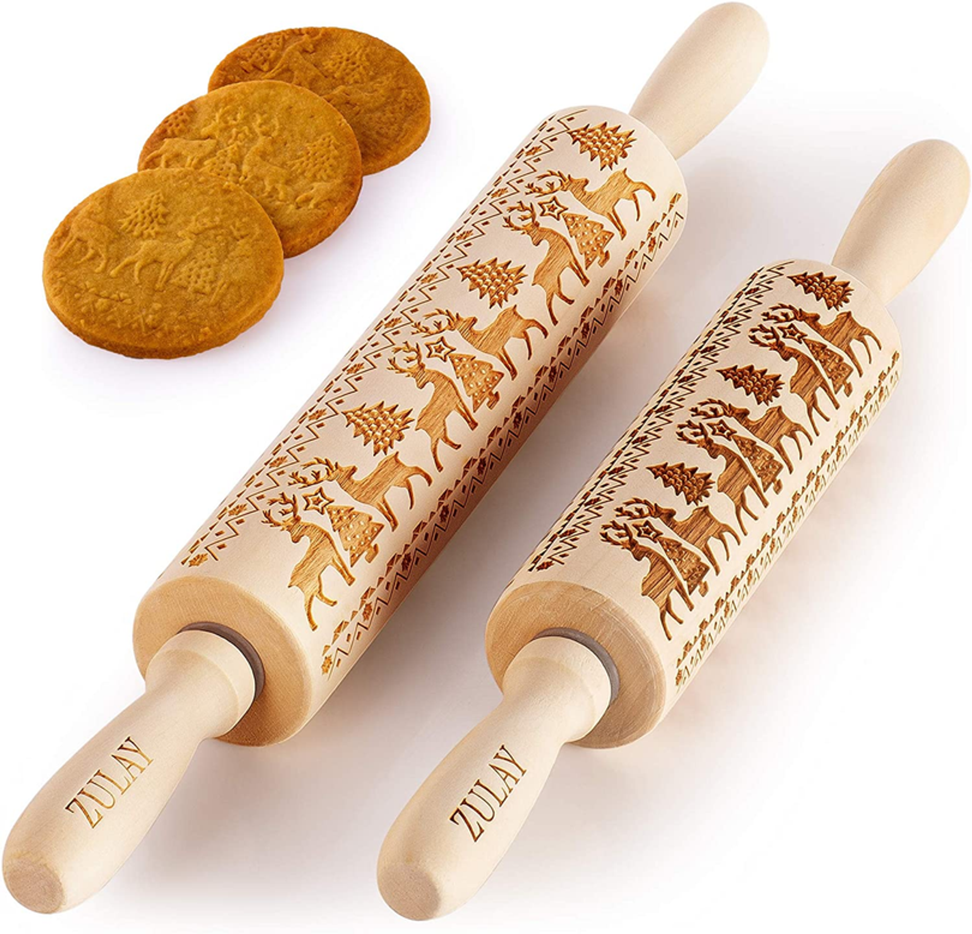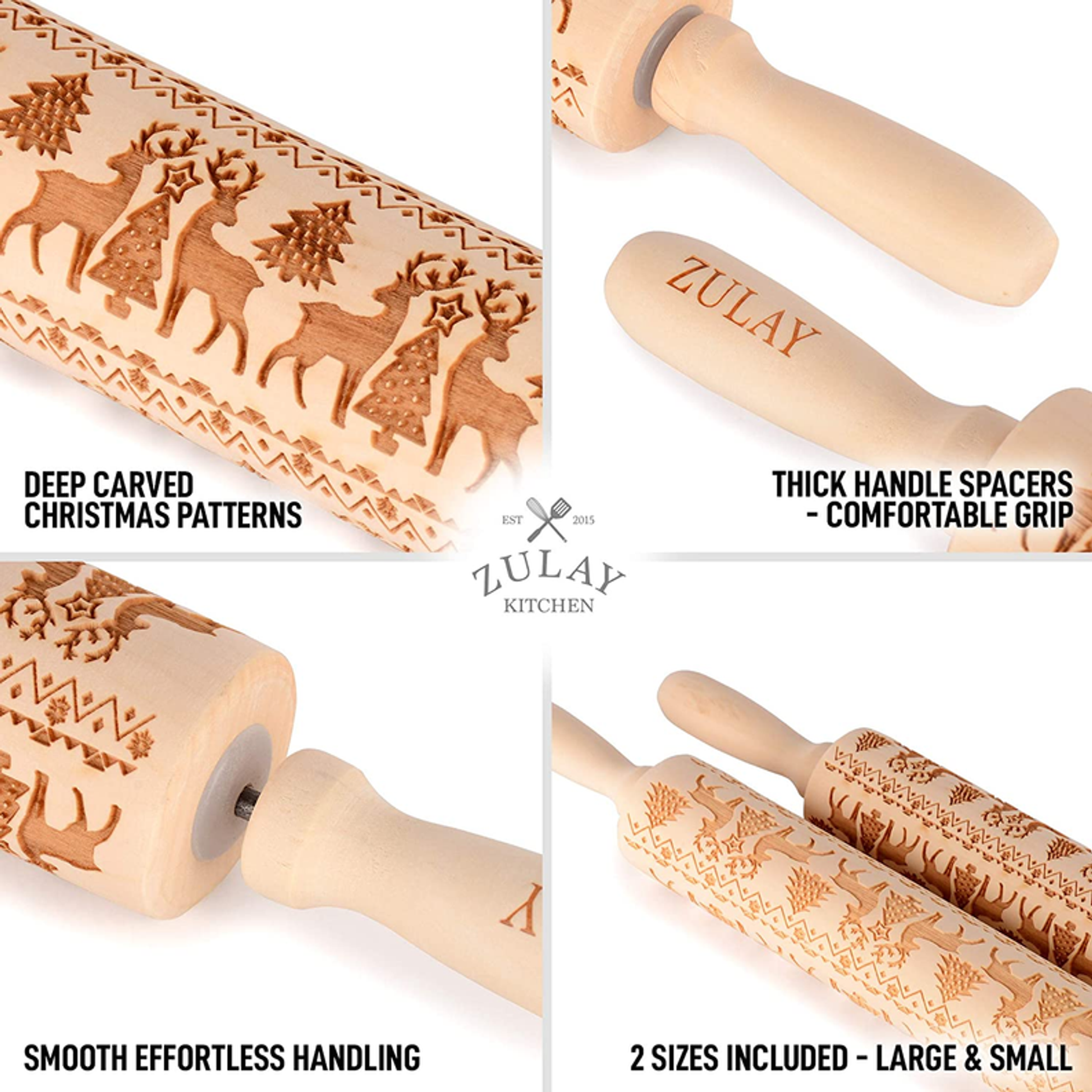 Bringing Out The Christmas Spirit : Make your holiday extra special by baking homemade dessert for your loved ones with the Zulay Kitchen Embossed Rolling Pin! Made with premium quality solid wood with engraved Christmas tree and deer pattern. Perfect for adding a decorative final touch to your dough before baking. Deeper Engraved Pattern : Having a tool that turns regular sugar cookies into a gift-worthy dessert with no hassle is like a treat from Santa himself. Ergonomically designed with a comfortable handle that rolls smoothly into the dough and carving a cheery Christmas pattern at the same time. Note: Make sure to generously flour the roller so that it won't stick in the dough. Rolling Pin Set In 2 Sizes : Christmas is the season where we take everything to the next level so why settle for one if you can have twor rolling pin comes in 2 sizes large and small making it possible for your kids or loved ones to participate and have fun in baking holiday treats. Great Gift Idea : Perfect gift for your family loved ones friends colleagues or for someone who loves to bake. Our rolling pin can be easily cleaned by wiping the exterior with a damp cloth using a gentle bristle brush in the pattern to remove residue and washing it under running water. Air-dry first before storing. No Hassle Kitchen Happiness Zulay Guarantee : We love and take pride in our Embossed Rolling Pin Set of 2 and we back this up with a lifetime guarantee. If there are ever any issues just contact us and we will make it right. Order now and be assured that this product will live up to your expectations guaranteed. If it does not we got you covered (even after the Amazon return window). Chances are you will never need to reach out!
