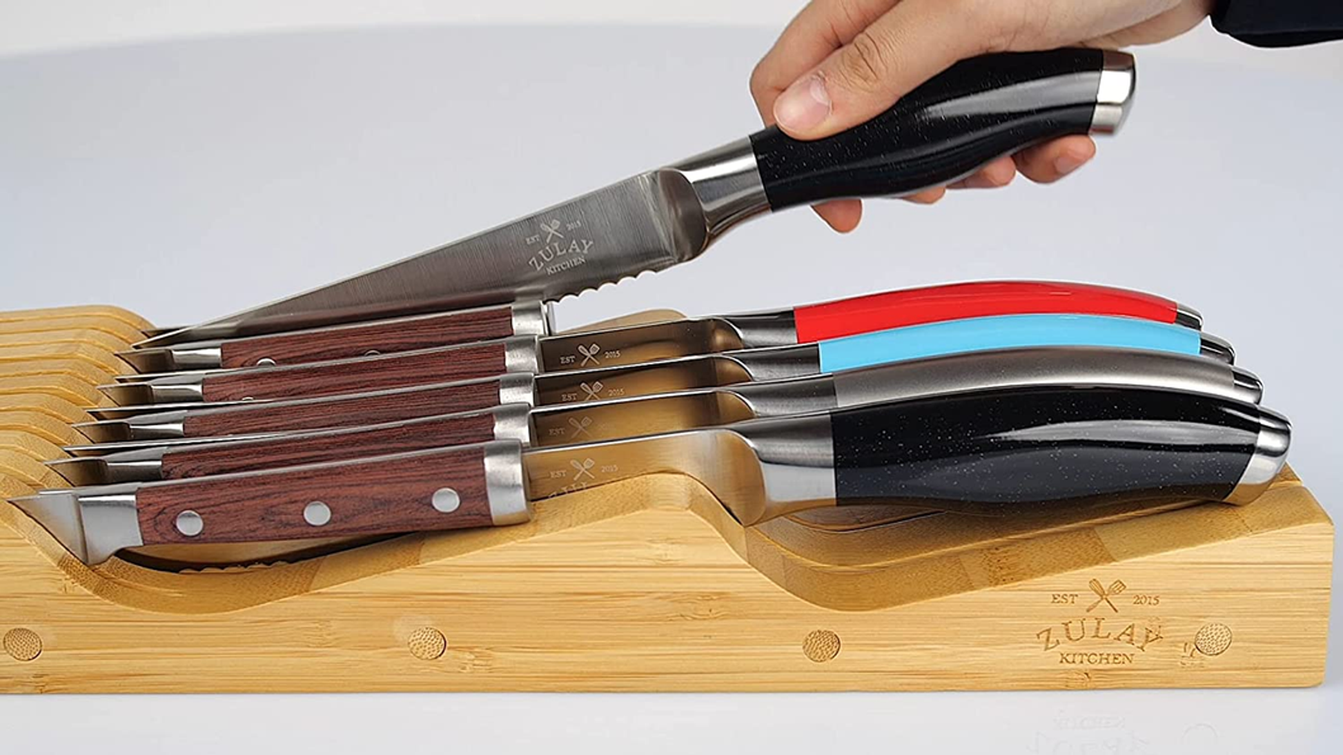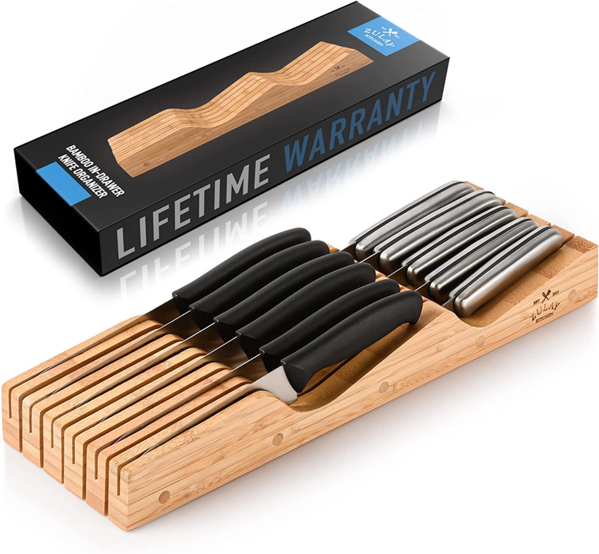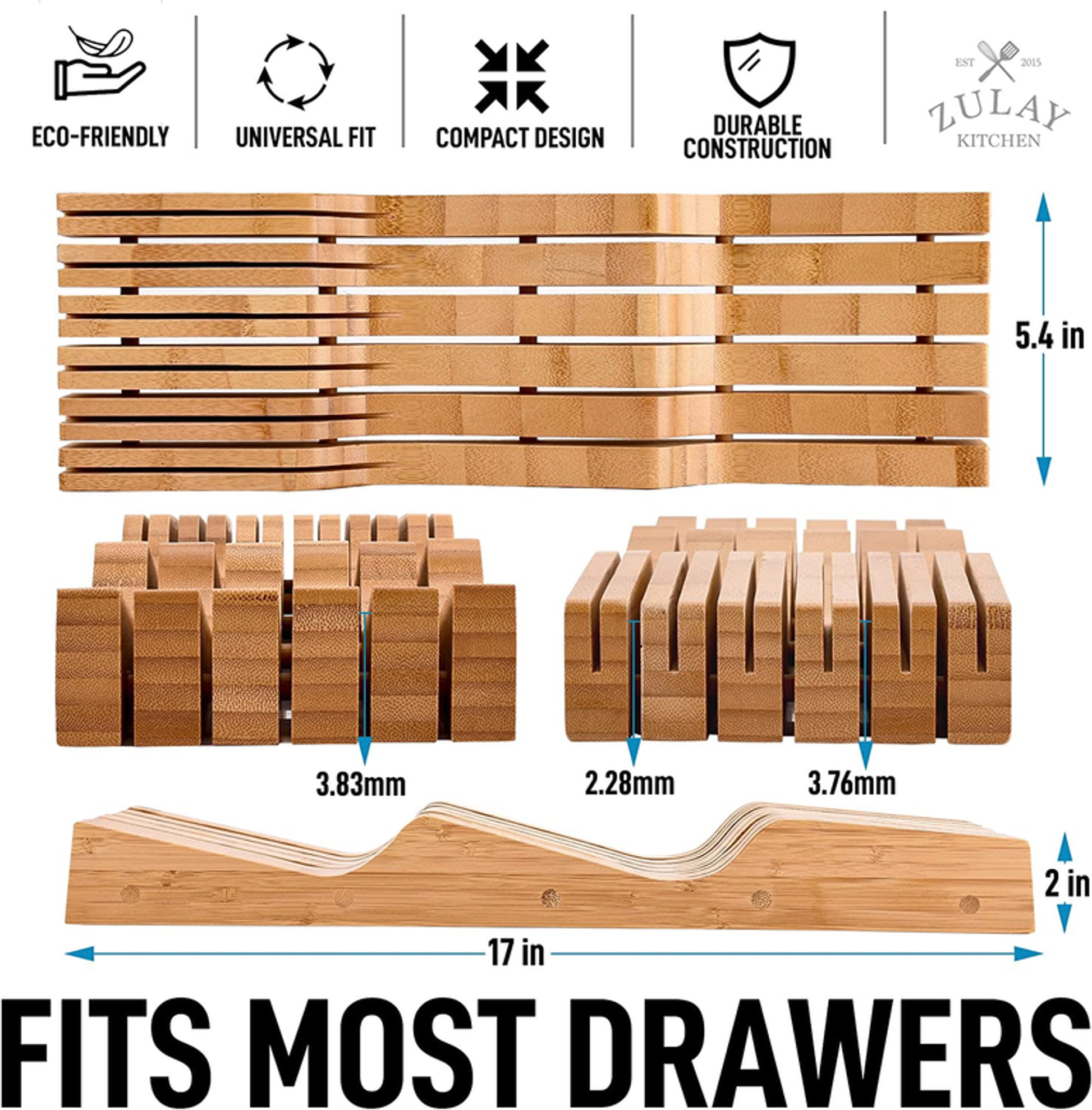 Space-saving Design Fits in Most Drawers: The Zulay Kitchen Bamboo Knife Block is an ingenious and space-saving knife storage tool that is designed to keep your counter space free and increases the overall capacity of your in-drawer shelf. It's 17 inches long 5.4 inches wide and 2 inches tall dimension is thoughtfully engineered to fit right inside all standard kitchen drawers. Note: Knives NOT included. Premium Quality Material That is Made to Last: Made of premium quality bamboo has a 2-inch depth streamline design that can fit up to 11 knives of varying sizes including steak utility bread santoku and paring knives. Its inches slot width is engineered to accommodate knives with large or curved blades and handles. Innovative & Functional Design: Well-made and nicely-finished knife organizer that has a smooth rounded edge that will surely make your drawers look beautiful attractive and neatly organized. Its innovative design is made to prevent knives from jamming or cluttering up your drawer. The knives are easy to remove and can insert efficiently into their individual slots which makes them very accessible. Perfect Solution to Your Knife Storage Needs: You can now efficiently organize your knives by storing them right inside your drawer. This knife block is a better alternative to your clunky countertop knife holder that is left in plain sight. Its water-resistant surface can be cleaned easily by simply wiping down with a damp cloth then rubbing it with some olive oil to extend its glossy exterior finish.